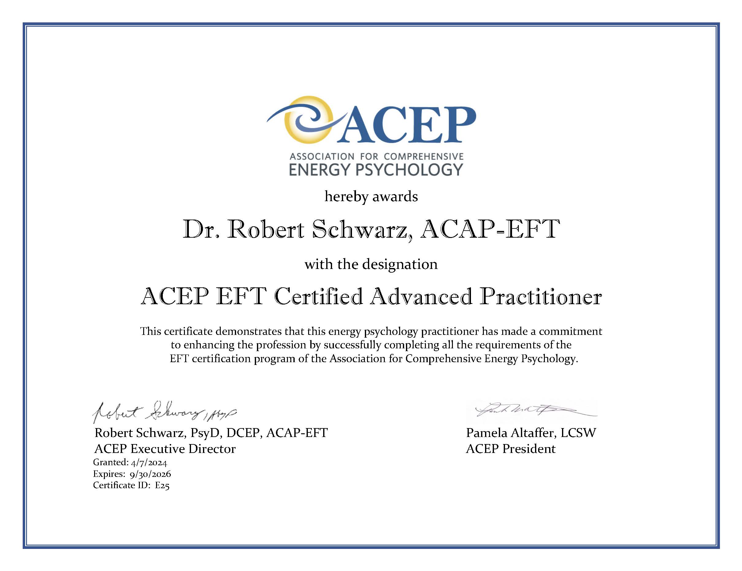 Dr Schwarz has been a licensed psychologist for over 35 years and practicing “Tapping” for over 25 years. He is an ACEP Advanced Practitioner of EFT. He is a diplomat in comprehensive Energy Psychology and is diagnostically Certified in Thought Field Therapy. Bob has been training practitioners in EFT and other Energy Psychology Techniques for over 20 years. Bob is an expert in working with Trauma and PTSD, Relationships and Business and Sports and Arts Performance Coaching.
